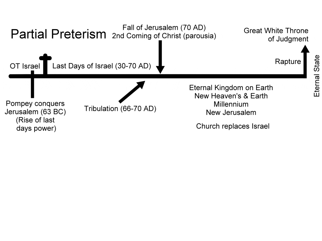 Those who hold to partial preterism believe that the prophecies in Daniel, Matthew 24, and Revelation (with the exception of the last two or three chapters) have already been fulfilled and were fulfilled no later than the first century AD. According to partial preterism, there is no rapture, and passages describing the tribulation and the Antichrist are actually referring to the destruction of Jerusalem in AD 70 and the Roman emperor Titus. Partial preterists do believe in the return of Christ to earth and a future resurrection and judgment, but they do not teach a millennial kingdom or that Israel as a nation has a place in God’s future plan. According to partial preterists, the Bible’s references to “the last days” are speaking of the last days of the Old Jewish Covenant, not the last days of the earth itself.