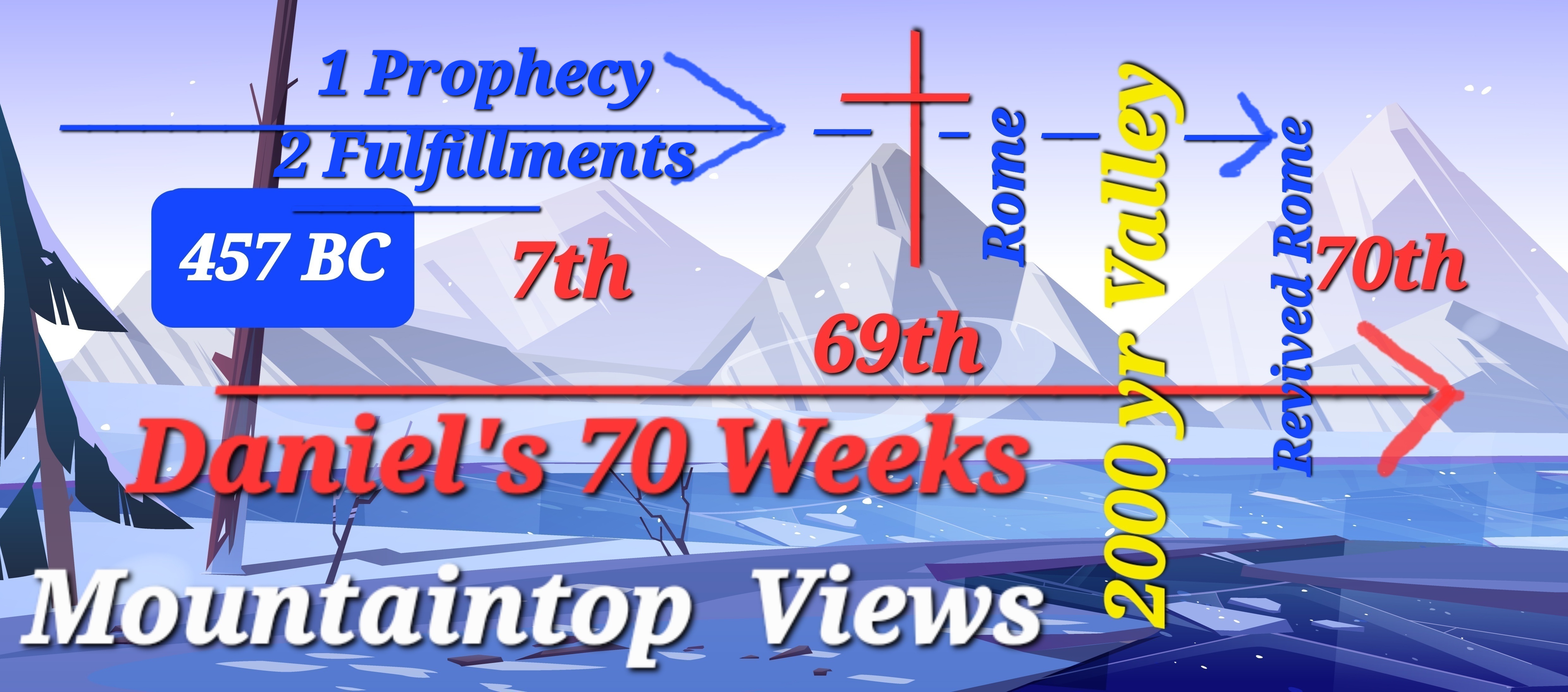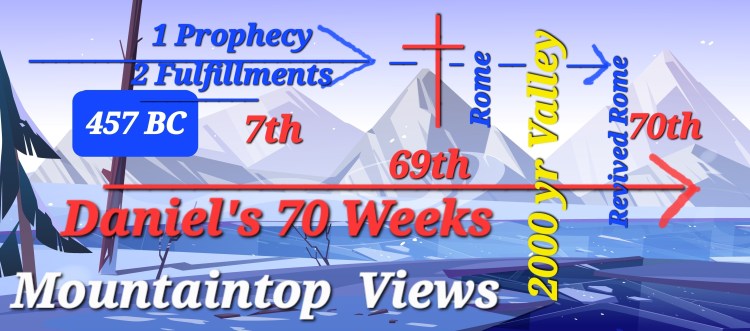 The 2000 year valley of the Gentiles between the ascension of Jesus and the revealing of the Anti-Christ; with the prophet Daniel it was only one thought, one breath, one sigh. In Daniel’s seeing; it is given only one verse. (Daniel 9:26 to Daniel 9:27). Why? Daniel is only seeing the mountain tops concerning Israel! In Daniel’s vision of the “70 Weeks” it was not revealed to him that God was going to add 2000 Gentile years between the 69th week and the 70th week because of Israel rejecting Christ, their Messiah and King. And yet here we are, able at the end of those 2000 years to see clearly what was in the valley!